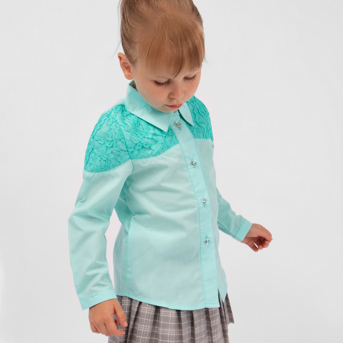 Нарядная блузка, выполненная в классическом стиле для девочки. Модель декорирована нежным кружевом. Рукав на узком манжете. Идеально подойдет для торжественного мероприятия. Размер 28 (рост 98 см): длина изделия 40 см, ширина 29 см, длина рукава 33 см. Размер 30 (рост 104 см): длина изделия 42 см, ширина 30 см, длина рукава 35 см. Размер 32 (рост 110 см): длина изделия 44 см, ширина 31 см, длина рукава 37 см. Размер 34 (рост 116 см): длина изделия 46 см, ширина 32 см, длина рукава 40 см. Размер 36 (рост 122 см): длина изделия 48 см, ширина 34 см, длина рукава 43 см.