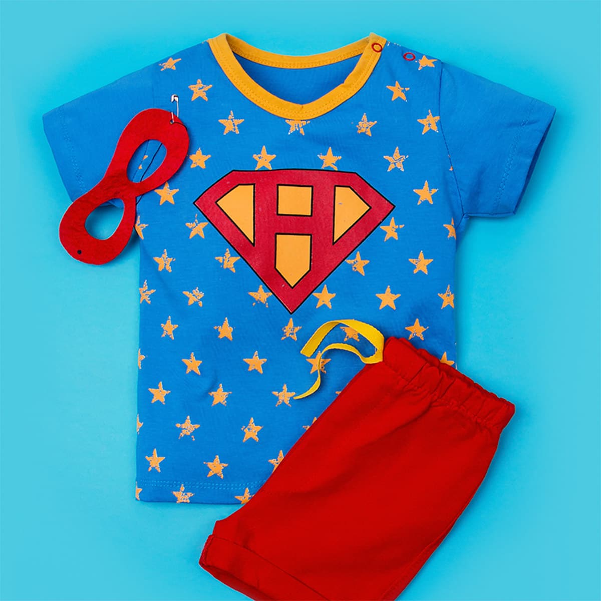 Легкий, хлопковый костюмчик для мальчика. Футболка с заклёпками на плече, украшена мультяшным принтом. Однотонные, трикотажные шорты с отворотами, не сковывают движений ребенка во время игры. Так же в костюм входит маска супер героя, которая непременно обрадует каждого мальчишку. Состав материала: 100% - хлопок. Рост указан приблизительно, выбирайте размер в соответствии с замерами. Размер 68-6 (рост 68 см): длина футболки 30 см, ширина 21 см; длина шорт 18 см, ширина 19 см. Размер 80-12 (рост 80 см): длина футболки 32 см, ширина 23 см; длина шорт 20 см, ширина 21 см. Размер 86-18 (рост 86 см): длина футболки 34 см, ширина 25 см; длина шорт 22 см, ширина 23 см.