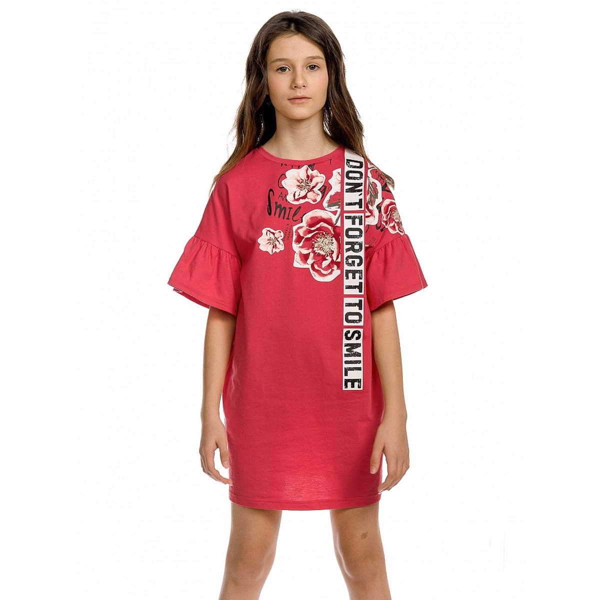 Платье для девочек. Платье из воздушного хлопкового трикотажа, модного прямого силуэта, цельнокроеный рукав притачным широким воланом. Мягкий эластичный принт, надпись «Не забывай улыбаться». Размер 116-6 (рост 116-122 см) длина изделия 63 см, полуобхват груди 36 см. Размер 122-7 (рост 122-128 см) длина изделия 65 см, полуобхват груди 37 см. Размер 8 (рост 128-134 см) длина изделия 68 см, полуобхват груди 39 см. Размер 9 (рост 134-140 см) длина изделия 71 см, полуобхват груди 41 см. Размер 10 (рост 140-146 см) длина изделия 74 см, полуобхват груди 43 см. Размер 11 (рост 146-152 см) длина изделия 76 см, полуобхват груди а 44 см.