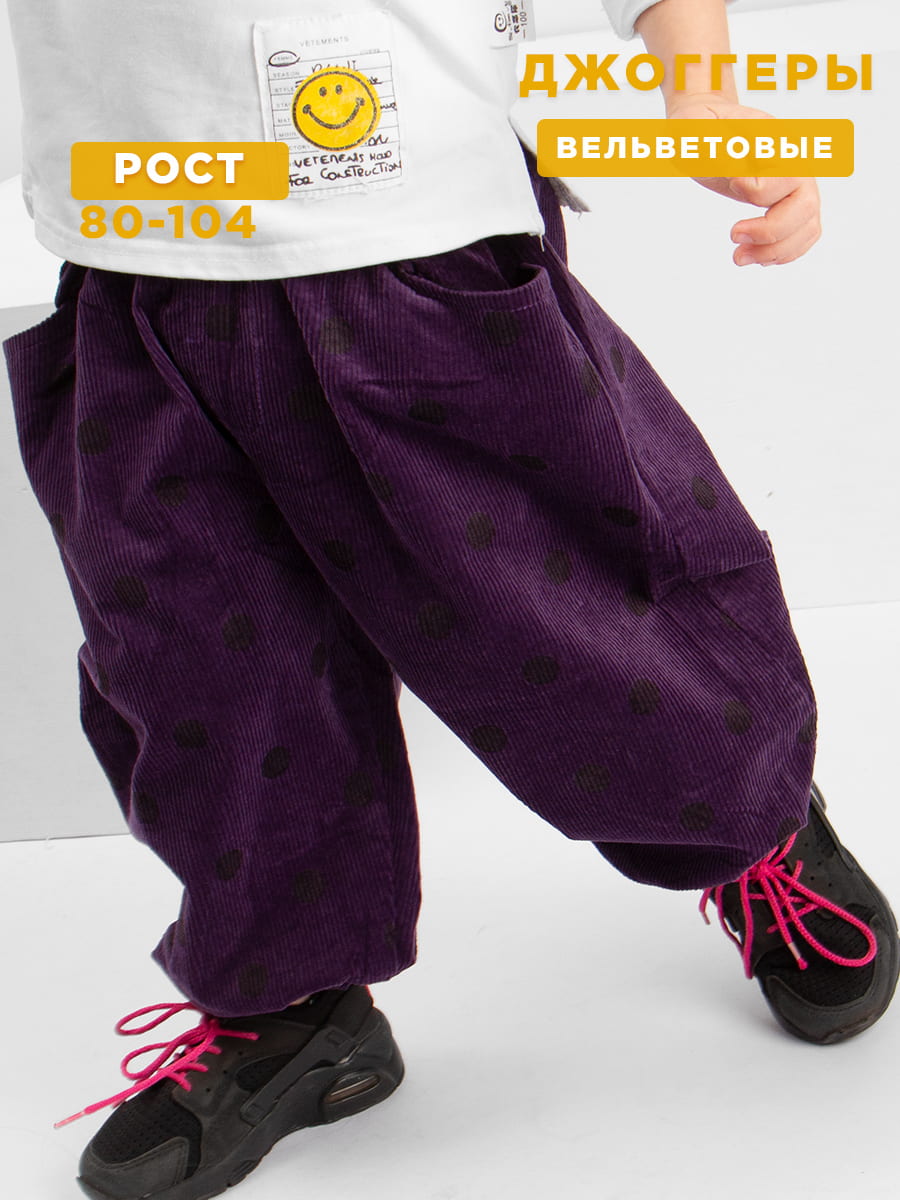 Детские брюки-джоггеры, выполненные из вельвета в рубчик. Модель на широкой, эластичной резинке, без молнии и пуговиц. Брючины свободные в районе бедер и зауженные к низу, с манжетами. Размер 80/M (рост 74-80 см) длина по внешнему шву 48 см, по внутреннему 26 см, ОТ 44 см, ОБ 62 см. Размер 86/L (рост 80-86 см) длина по внешнему шву 50 см, по внутреннему 28 см, ОТ 46 см, ОБ 64 см. Размер 92/XL (рост 86-92 см) длина по внешнему шву 51 см, по внутреннему 29 см, ОТ 48 см, ОБ 66 см. Размер 98/2XL (рост 92-98 см) длина по внешнему шву 52 см, по внутреннему 30 см, ОТ 50 см, ОБ 68 см. Размер 104/3XL (рост 98-104 см) длина по внешнему шву 54 см, по внутреннему 32 см, ОТ 50 см, ОБ 70 см.