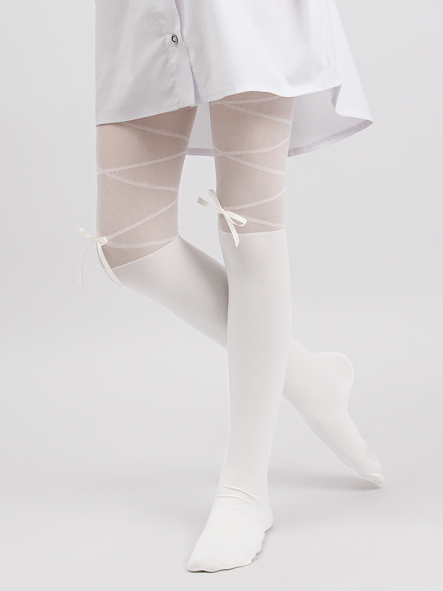 Легкие, капроновые колготки, с имитацией гольфин и рисунком "полоски", декорированные атласными бантиками. Модель прекрасно подойдет как для торжественных мероприятий, так и для повседневного образа. Размер 122-134/M (рост 122-134 см) Размер 140-152/L (рост 140-152 см)