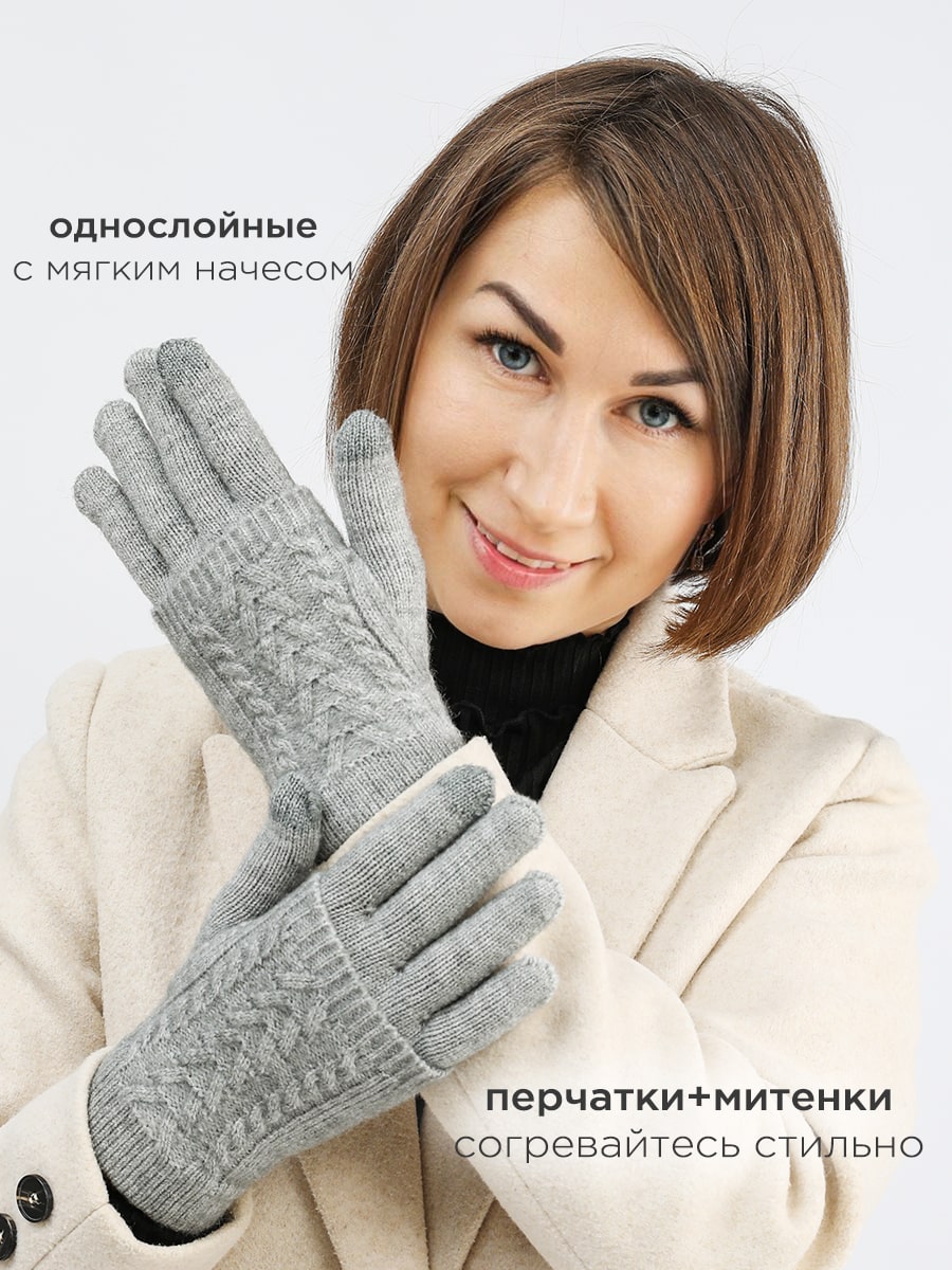 Перчатки женские, однослойные, из вязаного трикотажа, в комплекте с митенками, которые можно носить, как отдельно от изделия, так и вместе. Перчатки отлично сохраняют тепло и защищают руки от мороза в холодное время года. Большой и указательный пальцы адаптированы для использования сенсорного телефона. Размер = примерный обхват ладони. Размер 18-20 см (универсальный)