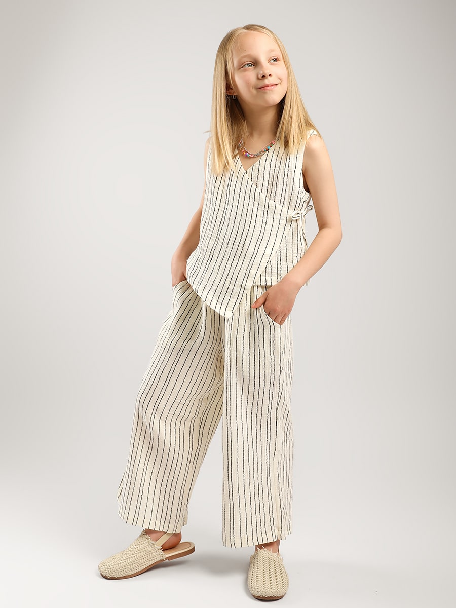 Детский летний костюм Соль&Перец, состоит из топа и брюк, выполнен из нежного двухслойного муслина, который создаёт лёгкую и воздушную текстуру. Топ на завязках, свободного кроя, брюки с карманами, по талии с широким, эластичным поясом. Этот костюм станет отличным выбором как для повседневной носки, так и для особых случаев, будь то прогулка в парке, поход на пляж или семейное мероприятие. Ваш ребёнок будет чувствовать себя комфортно и уверенно в этом стильном и удобном костюме. Размер 104 (рост 104-110 см) длина топа 32 см, ОГ 60 см, длина брюк по внешнему шву 58 см, по внутр. 38 см, ОТ 42-48 см, ОБ 76 см. Размер 110 (рост 110-116 см) длина топа 34 см, ОГ 62 см, длина брюк по внешнему шву 62 см, по внутр. 40 см, ОТ 44-50 см, ОБ 78 см. Размер 116 (рост 116-122 см) длина топа 36 см, ОГ 64 см, длина брюк по внешнему шву 66 см, по внутр. 42 см, ОТ 46-52 см, ОБ 80 см. Размер 122 (рост 122-128 см) длина топа 38 см, ОГ 68 см, длина брюк по внешнему шву 68 см, по внутр. 46 см, ОТ 48-54 см, ОБ 82 см.