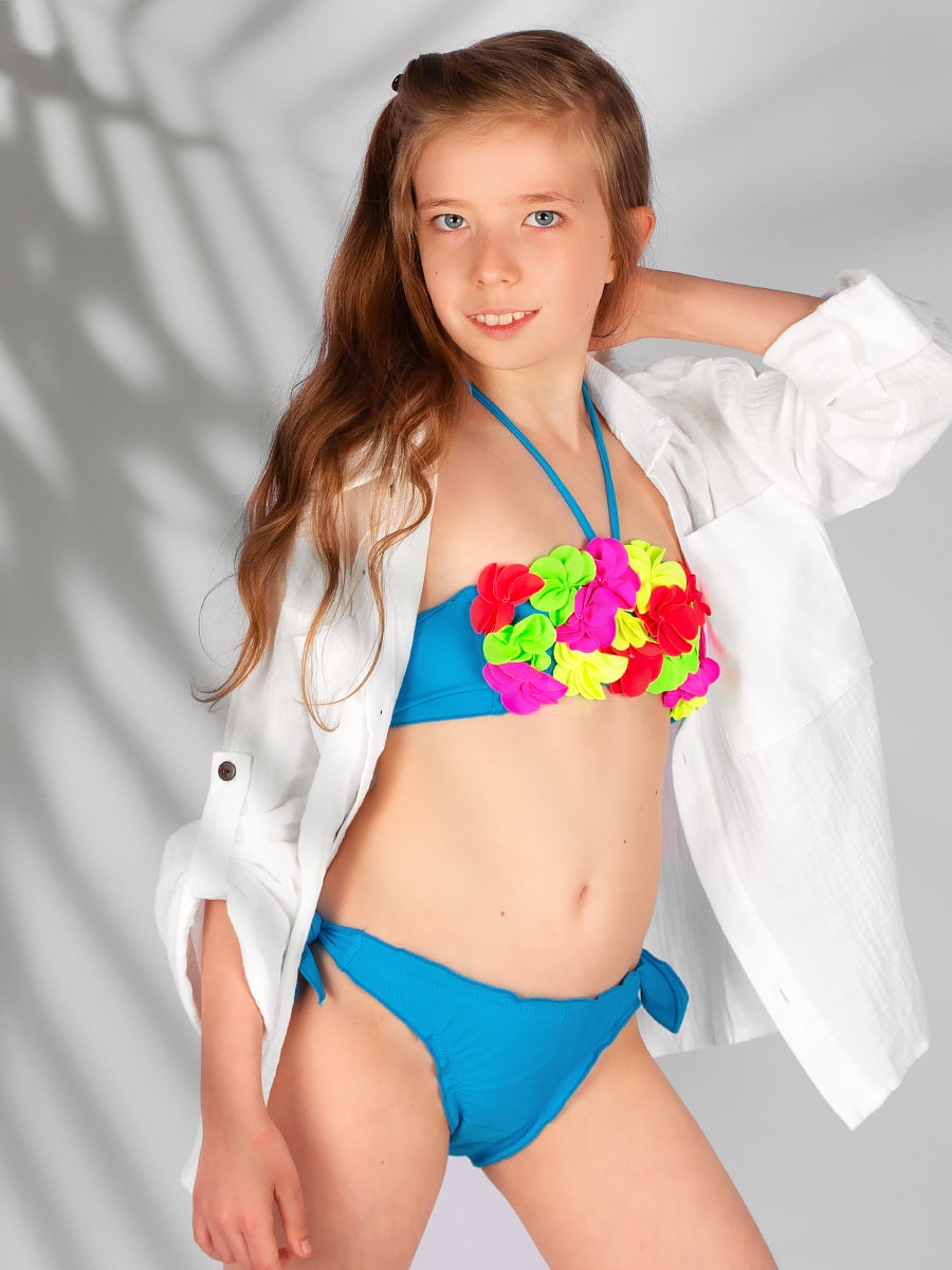 Купальник раздельный для девочки MID. Выполнен из эластичного материала, не выгорает на солнце, быстро сохнет и не теряет своей первоначальной формы. Топ – бандо с тонкой завязкой на шее и платочной завязкой на спине, декорирован объёмной, цветочной аппликацией. Плавки классической комфортной посадки с завязками по бокам – для удобной регулировки объёма, декорированы милыми рюшами. Замечательный выбор для летнего отдыха. Размер 128-34 (рост 122-128 см) обхват груди 62 см, обхват талии 54 см. Размер 134-36 (рост 128-134 см) обхват груди 64 см, обхват талии 56 см. Размер 140-38 (рост 134-140 см) обхват груди 66 см, обхват талии 58 см. Размер 146-40 (рост 140-146 см) обхват груди 68 см, обхват талии 60 см. Размер 152-42 (рост 146-152 см) обхват груди 70 см, обхват талии 62 см.