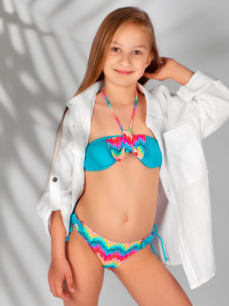 Раздельный купальник, с модным принтом, для девочки. Выполнен из эластичного материала, не выгорает на солнце, быстро сохнет и не теряет своей первоначальной формы. Лиф и трусики с завязками. Замечательный выбор для летнего отдыха. Размер 110-28 - рост 104-110 см Размер 116-30 - рост 110-116 см Размер 122-32 - рост 116-122 см Размер 128-34 - рост 122-128 см Размер 134-36 - рост 128-134 см