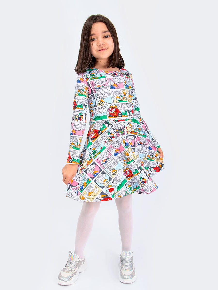 Яркое, трикотажное платье с приталенным верхом и расклешенной юбкой. Модель декорирована красочным, мультяшным принтом. Материал мягкий и приятный к телу, прекрасно пропускает воздух, не электризуется. Размер 134-9 (рост 128-134 см) длина изделия 73 см, полуобхват груди 35 см, длина рукава 48 см. Размер 140-10 (рост 134-140 см) длина изделия 77 см, полуобхват груди 36 см, длина рукава 50 см. Размер 146-11 (рост 140-146 см) длина изделия 81 см, полуобхват груди 37 см, длина рукава 52 см. Размер 152-12 (рост 146-152 см) длина изделия 85 см, полуобхват груди 38 см, длина рукава 55 см.