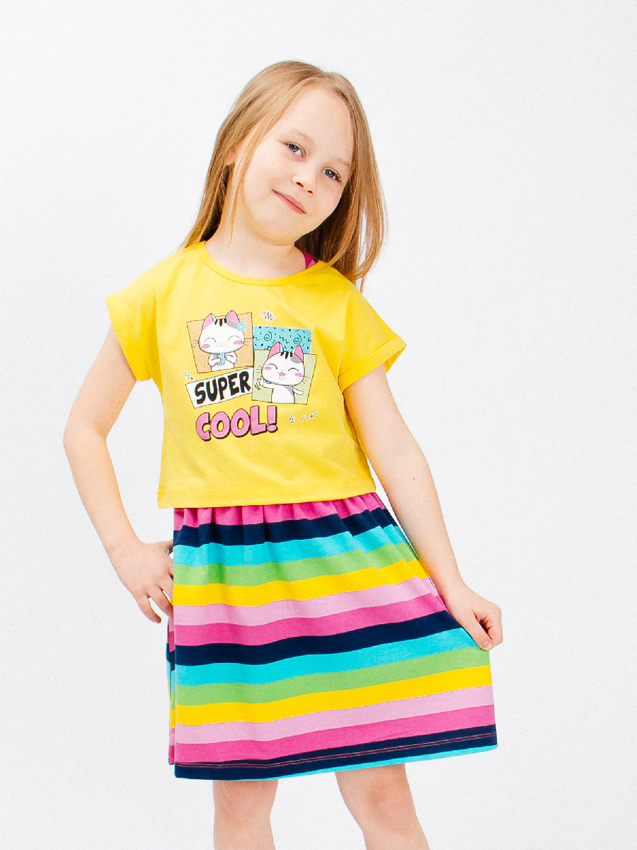 Яркое, трикотажное платье с приталенным верхом и расклешенной юбкой. Модель декорирована оригинальным принтом. Материал мягкий и приятный к телу, прекрасно пропускает воздух, не электризуется. Размер 134-9 (рост 128-134 см) длина изделия 73 см, полуобхват груди 36 см, длина рукава 47 см. Размер 140-10 (рост 134-140 см) длина изделия 76 см, полуобхват груди 37 см, длина рукава 49 см. Размер 146-11 (рост 140-146 см) длина изделия 80 см, полуобхват груди 38 см, длина рукава 51 см. Размер 152-12 (рост 146-152 см) длина изделия 83 см, полуобхват груди 39 см, длина рукава 53 см.