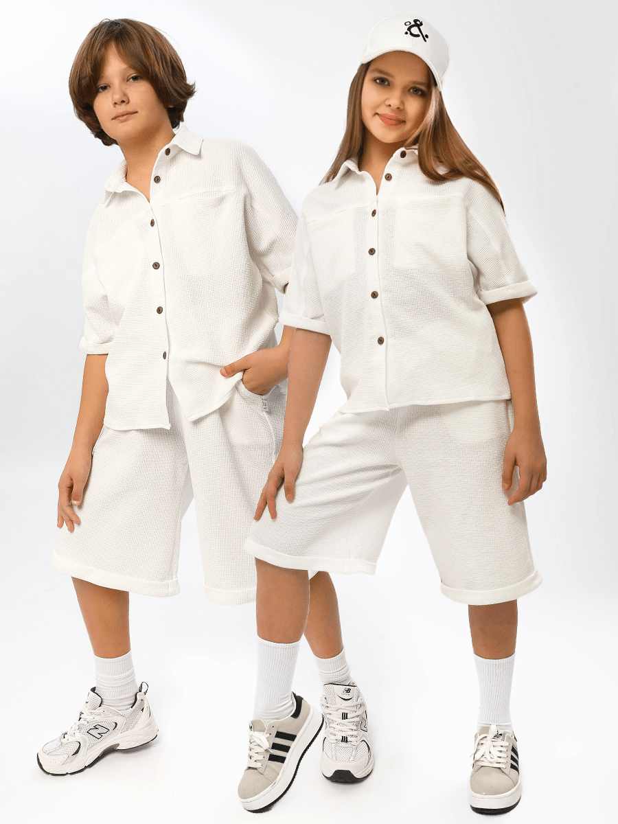 Летний детский костюм Соль&Перец, выполнен из натурального хлопкового вафельного трикотажа. Рубашка свободного кроя с потайными карманами на груди, удлинённые шорты с карманами, по талии на широкой, эластичной резинке. Костюм из хлопковой ткани вафельной текстуры хорошо пропускает воздух, защищает от солнца и подходит для чувствительной кожи. Отличный вариант для летнего отдыха. Размер 140 (рост 140-146 см) длина рубашки 48 см, ОГ 82 см, длина шорт 50 см, ОТ 56 см, ОБ 90 см. Размер 146 (рост 146-152 см) длина рубашки 50 см, ОГ 86 см, длина шорт 52 см, ОТ 58 см, ОБ 92 см. Размер 152 (рост 152-158 см) длина рубашки 52 см, ОГ 90 см, длина шорт 54 см, ОТ 60 см, ОБ 94 см. Размер 158 (рост 158-164 см) длина рубашки 54 см, ОГ 92 см, длина шорт 56 см, ОТ 62 см, ОБ 96 см. Размер 164 (рост 164-170 см) длина рубашки 56 см, ОГ 102 см, длина шорт 58 см, ОТ 64 см, ОБ 98 см.