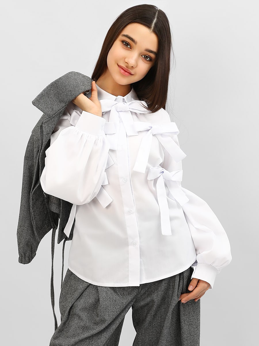 Блузка для девочки Соль&Перец, на пуговицах, из натурального хлопка. Особенностью блузки являются пышные рукава фонарики и пришитые ленты из основной ткани, которые добавляют ей изящества и уникальности. Блузка прекрасно сочетается с брюками или с юбкой, подчеркнёт индивидуальный стиль девочки, и разнообразит ее повседневный школьный образ. Размер 134 (рост 128-134 см) длина изделия 54 см, обхват груди 80 см, длина рукава 48 см. Размер 140 (рост 134-140 см) длина изделия 56 см, обхват груди 84 см, длина рукава 50 см. Размер 146 (рост 140-146 см) длина изделия 58 см, обхват груди 88 см, длина рукава 52 см. Размер 152 (рост 146-152 см) длина изделия 60 см, обхват груди 92 см, длина рукава 54 см. Размер 158 (рост 152-158 см) длина изделия 62 см, обхват груди 100 см, длина рукава 56 см. Размер 164 (рост 158-164 см) длина изделия 64 см, обхват груди 102 см, длина рукава 58 см.