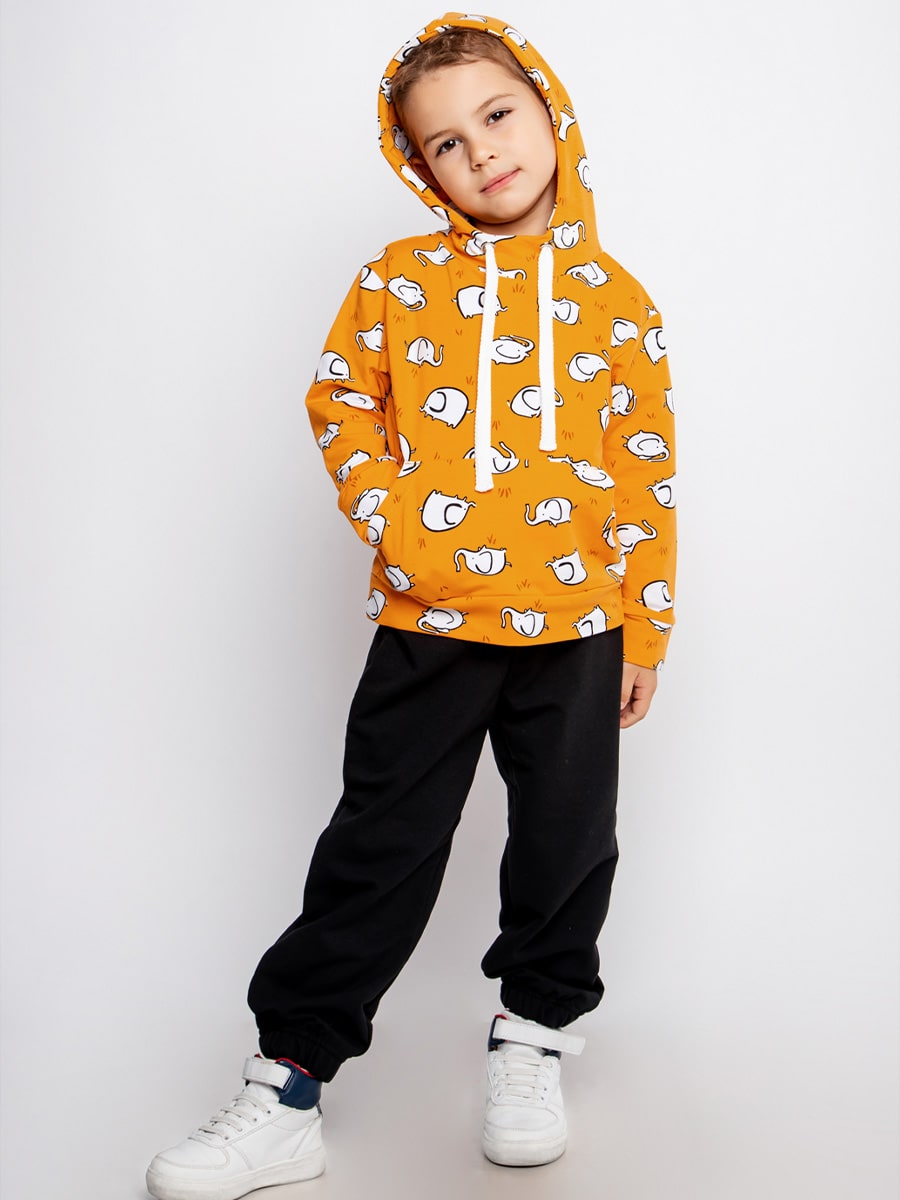 Кофта с капюшоном свободного силуэта. Брюки с мягкой резинкой по талии и манжетами по низу брючин. Плотный и эластичный трикотаж футер-петля хорошо пропускает воздух, не теряет формы, способен удерживать тепло. Отличный вариант для дома или прогулки в холодное время года. Размер 92 (рост 92 см) длина кофты 34 см, обхват груди 64 см, длина рукава 32 см, длина брюк по боковому шву 50 см, по внутреннему 30 см, обхват талии 48 см. Размер 104 (рост 104 см) длина кофты 38 см, обхват груди 68 см, длина рукава 34 см, длина брюк по боковому шву 56 см, по внутреннему 36 см, обхват талии 50 см. Размер 110 (рост 110 см) длина кофты 40 см, обхват груди 72 см, длина рукава 38 см, длина брюк по боковому шву 62 см, по внутреннему 44 см, обхват талии 54 см.