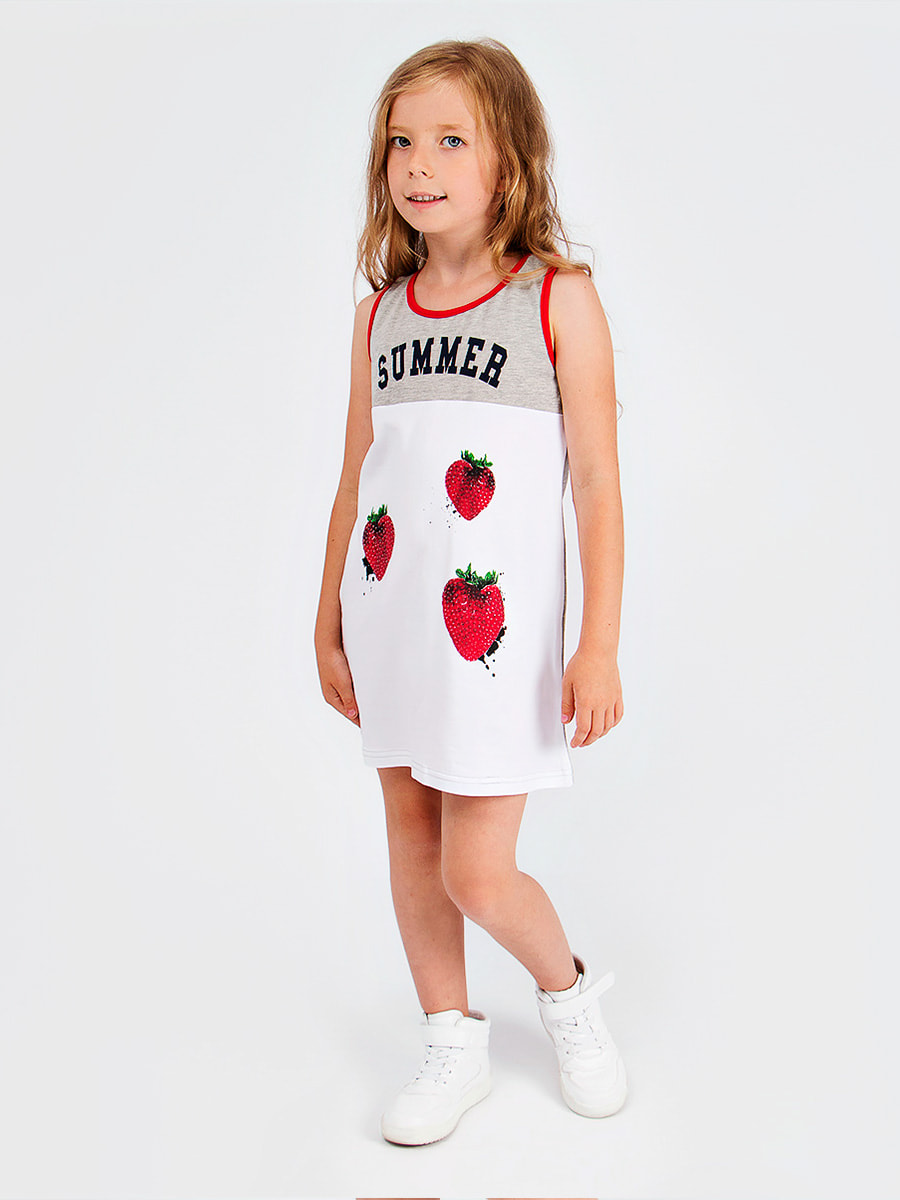 Сарафан Elnin Клубничка для девочки. Легкий, трикотажный сарафан, в спортивном стиле, для девочки. Модель декорирована свежим, летним принтом, и стразами. Идеальный вариант для повседневного образа. Состав материала: 95% - хлопок, 5% - эластан. Рост указан приблизительно, выбирайте размер в соответствии с замерами. Размер 98-3 (рост 92-98 см): длина изделия 47 см, ширина 28 см. Размер 104-4 (рост 98-104 см): длина изделия 51 см, ширина 30 см. Размер 110-5 (рост 104-110 см): длина изделия 54 см, ширина 31 см. Размер 116-6 (рост 110-116 см): длина изделия 57 см, ширина 33 см.