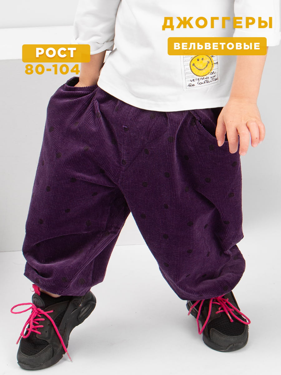 Детские брюки-джоггеры, выполненные из вельвета в рубчик. Модель на широкой, эластичной резинке, без молнии и пуговиц. Брючины свободные в районе бедер и зауженные к низу, с манжетами. Размер 80/M (рост 74-80 см) длина по внешнему шву 48 см, по внутреннему 26 см, ОТ 44 см, ОБ 62 см. Размер 86/L (рост 80-86 см) длина по внешнему шву 50 см, по внутреннему 28 см, ОТ 46 см, ОБ 64 см. Размер 92/XL (рост 86-92 см) длина по внешнему шву 51 см, по внутреннему 29 см, ОТ 48 см, ОБ 66 см. Размер 98/2XL (рост 92-98 см) длина по внешнему шву 52 см, по внутреннему 30 см, ОТ 50 см, ОБ 68 см. Размер 104/3XL (рост 98-104 см) длина по внешнему шву 54 см, по внутреннему 32 см, ОТ 50 см, ОБ 70 см.