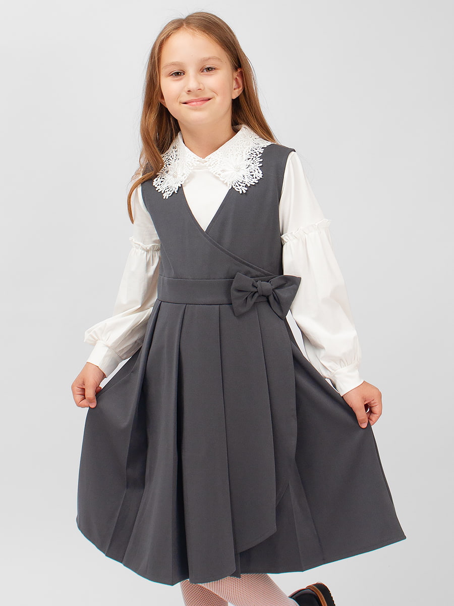 Сарафан с круглым вырезом, на широких бретелях, декорированный гипюром. На талии пояс, украшенный металлическими элементами. Подъюбник-съемный, пристегивается на пуговицы. Идеальный выбор для создания красивого школьного образа. Размер 116-30 (рост 116-122 см) длина изделия 62 см, полуобхват груди 32 см. Размер 122-32 (рост 122-128 см) длина изделия 67 см, полуобхват груди 34 см. Размер 128-32 (рост 128-134 см) длина изделия 71 см, полуобхват груди 35 см. Размер 134-34 (рост 134-140 см) длина изделия 75 см, полуобхват груди 37 см. Размер 140 (рост 140-146 см) длина изделия 79см, полуобхват груди 38 см. Размер 146 (рост 146-152 см) длина изделия 82см, полуобхват груди 40 см.