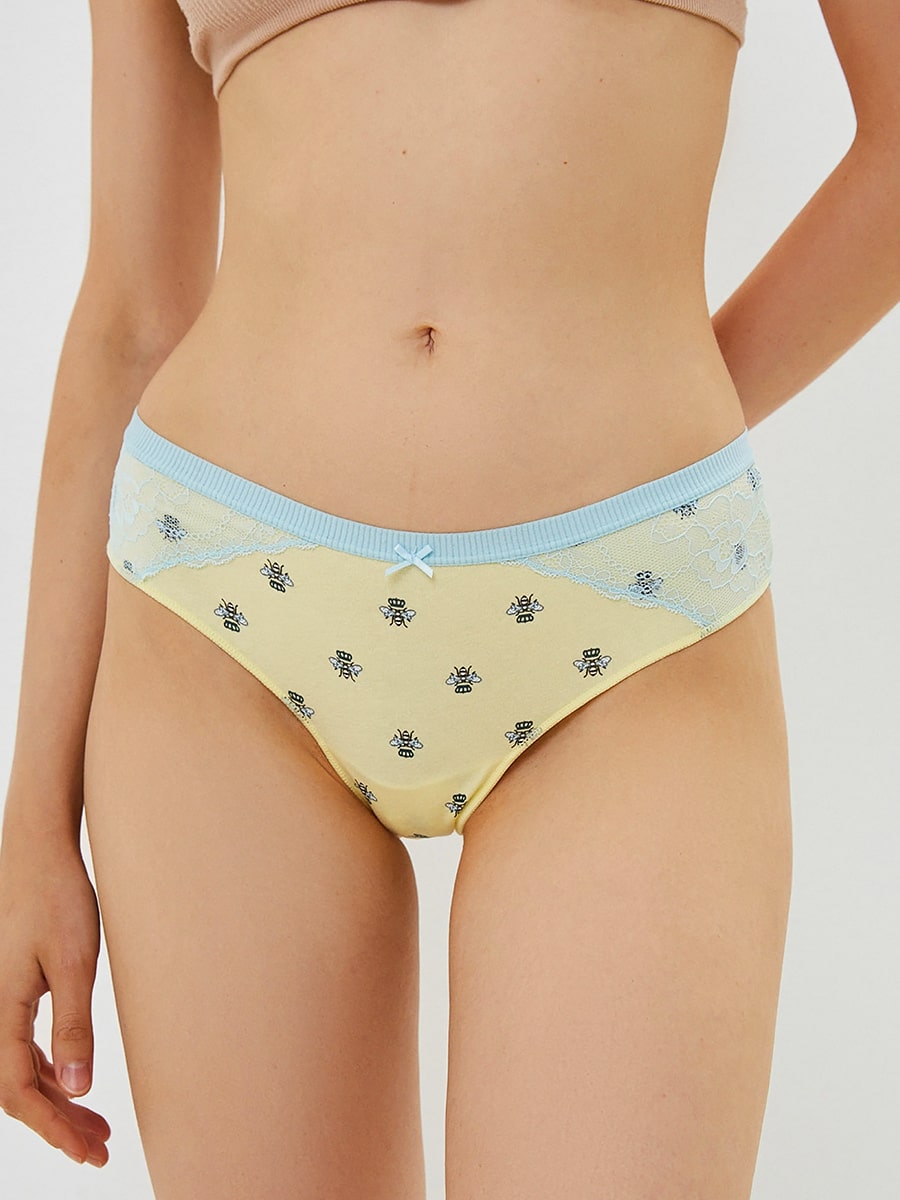 Трусы-стринги из хлопка, с принтом, с кружевным обрамлением, с кружевной частью сзади, на мягкой резинке, средней посадки. Размер 46 (M) обхват бедер 92-98 см. Размер 48 (L) обхват бедер 98-104 см.