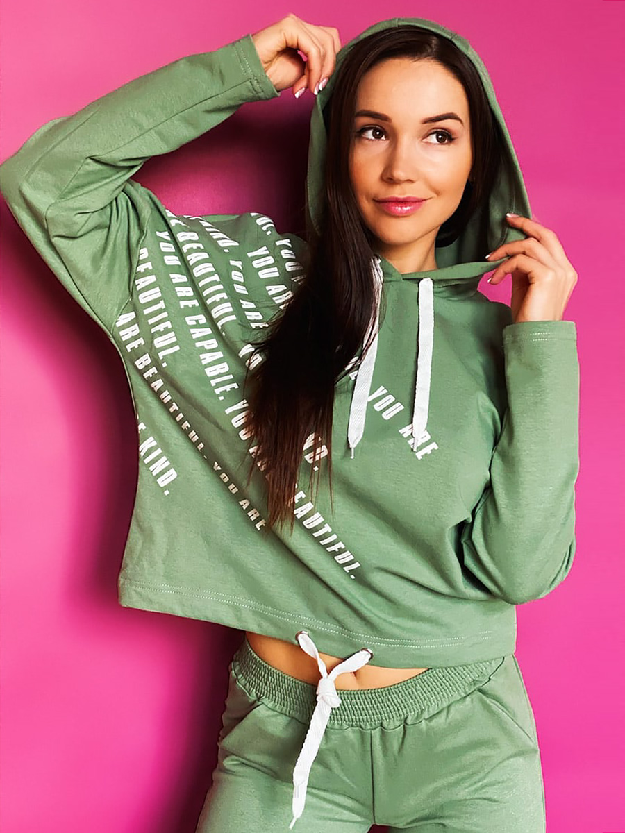 Толстовка с капюшоном прямого силуэта, рукав спущенный. Размер 42: длина изделия 61 см, длина рукава от горловины 72 см, полуобхват груди 60 см, полуобхват талии 49 см. Размер 44: длина изделия 62 см, длина рукава от горловины 72 см, полуобхват груди 62 см, полуобхват талии 51 см. Размер 46: длина изделия 63 см, длина рукава от горловины 72 см, полуобхват груди 64 см, полуобхват талии 53 см. Размер 48: длина изделия 64 см, длина рукава от горловины 72 см, полуобхват груди 66 см, полуобхват талии 55 см. Размер 50: длина изделия 65 см, длина рукава от горловины 72 см, полуобхват груди 68 см, полуобхват талии 57 см. Размер 52: длина изделия 66 см, длина рукава от горловины 72 см, полуобхват груди 70 см, полуобхват талии 59 см.