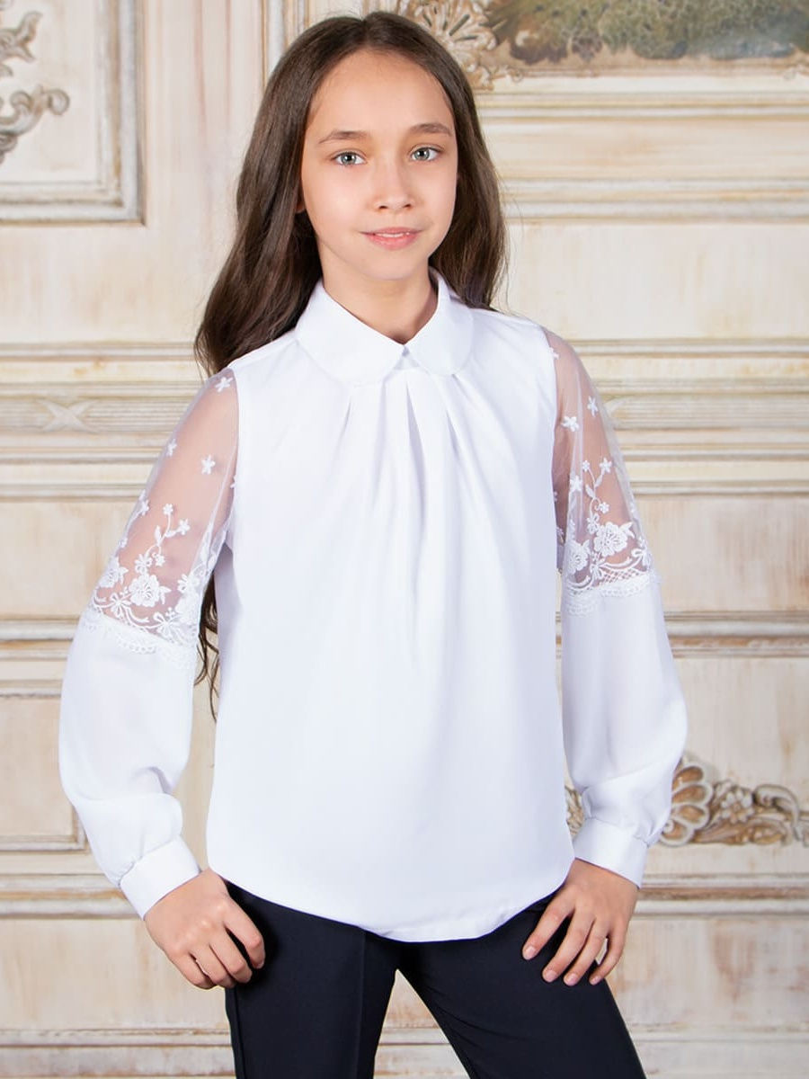 Элегантная блузка прямого силуэта для девочки. Передняя часть декорирована кружевом, отложной воротник выполнен из кружева, рукава украшены мягким фатином, на спинке застёжка-пуговица. Мягкий, приятный к телу трикотаж, обеспечит идеальную посадку изделия по фигуре. Прекрасный выбор для создания красивого школьного образа. Размер 120, рост 122 (122-128 см) длина изделия 46 см, обхват груди 70 см, длина рукава 42 см. Размер 130, рост 128 (128-134 см) длина изделия 48 см, обхват груди 72 см, длина рукава 44 см. Размер 140, рост 134 (134-140 см) длина изделия 50 см, обхват груди 76 см, длина рукава 46 см. Размер 150, рост 146 (140-146 см) длина изделия 52 см, обхват груди 78 см, длина рукава 48 см. Размер 160, рост 152 (146-152 см) длина изделия 54 см, обхват груди 80 см, длина рукава 50 см.