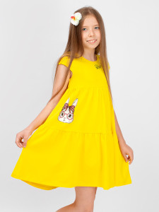 Легкое платье, украшенное принтом и аксессуаром-бантиком. Модель с завышенной линией талии, юбка выполнена из двух ярусов, что делает ее силуэт более пышным и романтичным. Натуральный материал кулирка-мягок и приятен к коже, обладает гигроскопичными и воздухопроницаемыми свойствами, идеально подходит для пошива детской одежды.