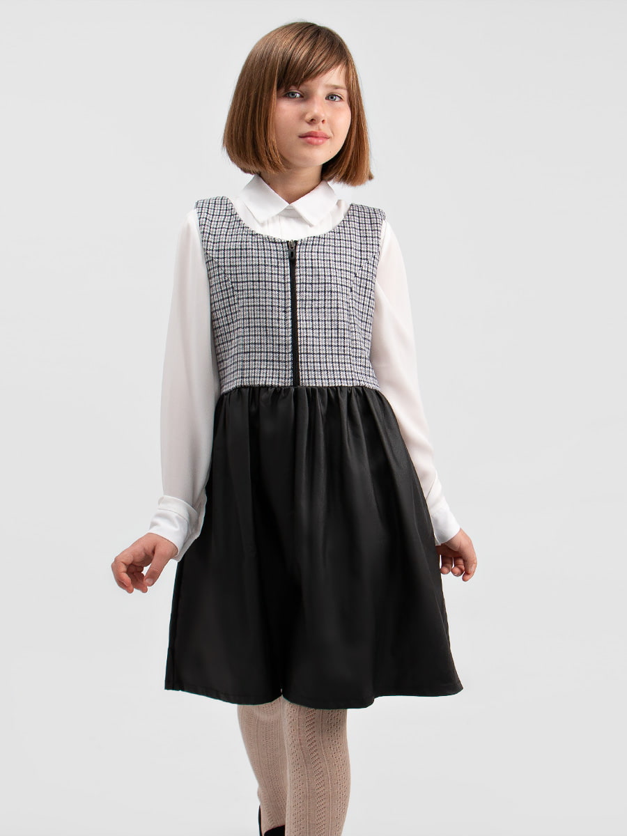 Элегантный сарафан из комбинированной ткани, отрезная кокетка выполнена из тёплого трикотажа и расклешенная юбочка из экокожи. Отлично сочетается с любой кофтой, рубашкой или блузкой.