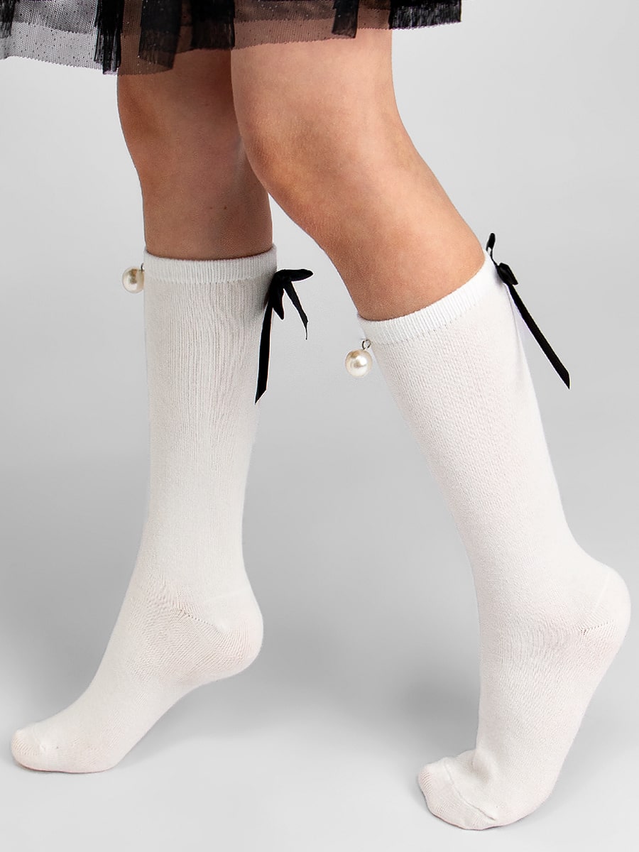 Фантазийные гольфы из натурального материала, декорированные жемчугом и бантиком. Мягкая, комфортная резинка плотно облегает ножку, не сдавливая ее. Все аксессуары пришиты. Модель прекрасно подойдет как для торжественных школьных мероприятий, так и для повседневного образа. Размер 5-8 (размер обуви 31-33) Размер 9-12 (размер обуви 34-37)