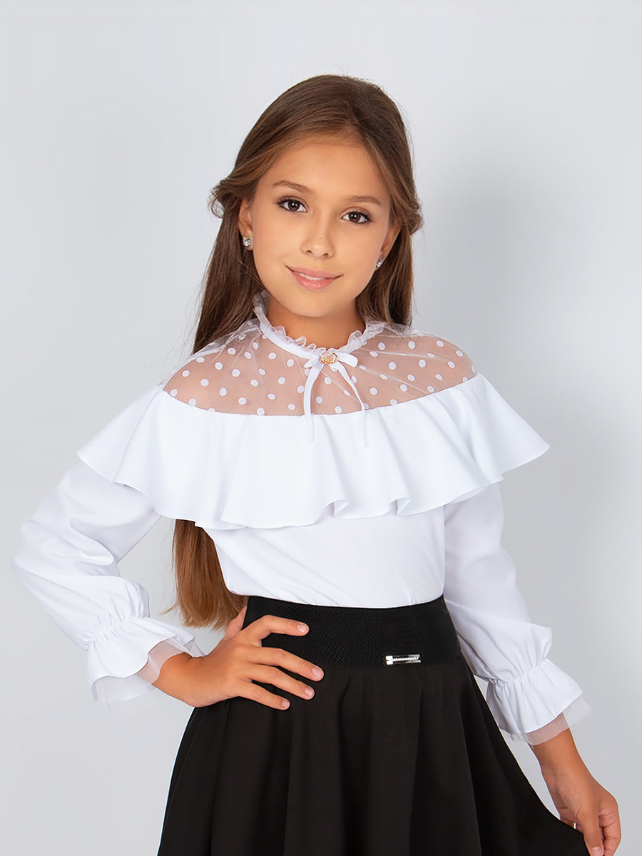 Блузка свободного силуэта, украшенная пышным воланом. Основная ткань - воздушный шифон, верхняя часть выполнена из фатина с флоковым декором в виде горошков, воротник украшен бархатной лентой, декоративные элементы включают блестящую фурнитуру со стразами, потайная молния на спине для удобства надевания, низ рукава на мягкой эластичной резинке. Блузка прекрасно подойдёт как для повседневной школьной носки, так и для праздничных мероприятий. Размер 128-34 (рост 128-134 см): длина изделия 46 см, ОГ 72 см, длина рукава 42 см. Размер 134-36 (рост 134-140 см): длина изделия 48 см, ОГ 74 см, длина рукава 44 см. Размер 140-38 (рост 140-146 см): длина изделия 52 см, ОГ 80 см, длина рукава 48 см. Размер 146-40 (рост 146-152 см): длина изделия 54 см, ОГ 84 см, длина рукава 50 см. Размер 152-42 (рост 152-158 см): длина изделия 56 см, ОГ 88 см, дл. рукава 52 см. Размер 158-44 (рост 158-164 см): длина изделия 58 см, ОГ 90 см, дл. рукава 54 см. Размер 164-46 (рост 164-170 см): дл. изделия 60 см, ОГ 96 см, дл. рукава 56 см.