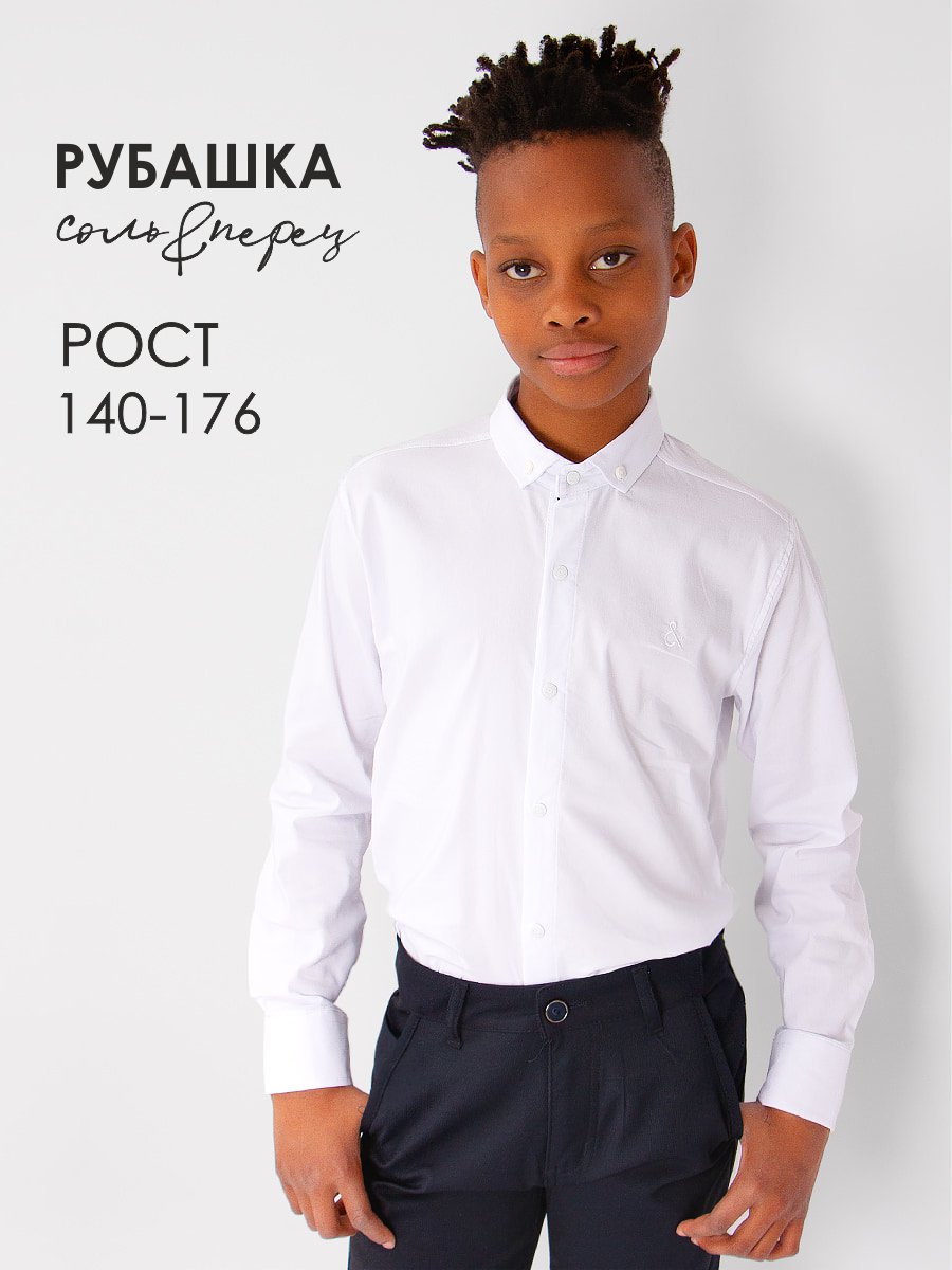 Классическая рубашка для мальчика Соль&Перец прямого силуэта, на кнопках. Модель идеально сочетается с брюками любого фасона и подойдет как для школы, так и для торжественного мероприятия. Размер 116 (рост 116-122 см) длина изделия 50 см, обхват груди 70 см, длина рукава 42 см. Размер 122 (рост 122-128 см) длина изделия 52 см, обхват груди 72 см, длина рукава 46 см. Размер 128 (рост 128-134 см) длина изделия 54 см, обхват груди 80 см, длина рукава 48 см. Размер 134 (рост 134-140 см) длина изделия 56 см, обхват груди 84 см, длина рукава 50 см. Размер 140 (рост 140-146 см) длина изделия 58 см, обхват груди 86 см, длина рукава 52 см. Размер 152 (рост 152-158 см) длина изделия 62 см, обхват груди 90 см, длина рукава 54 см. Размер 164 (рост 158-164 см) длина изделия 64 см, обхват груди 96 см, длина рукава 56 см. Размер 176 (рост 170-176 см) длина изделия 68 см, обхват груди 102 см, длина рукава 62 см.