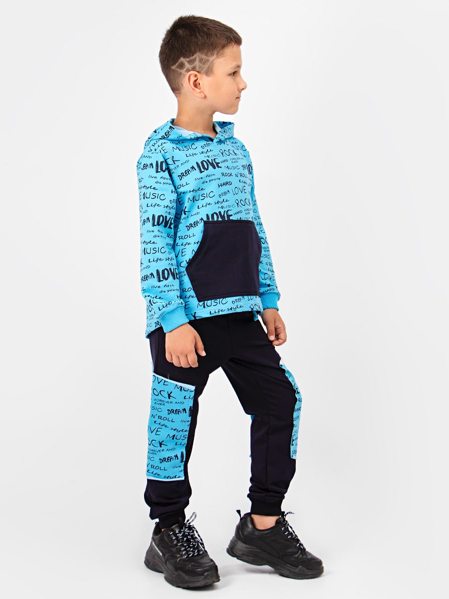 Кофта с капюшоном, спереди карман-кенгуру, брюки свободного кроя с контрастной вставкой, по низу брючин эластичные манжеты. Мягкий трикотаж футер хорошо пропускает воздух, обладает гипоаллергенными свойствами, не теряет формы. Размер 98(рост 98см) длина кофты 37см, обхват груди 70см, длина рукава 35см, длина брюк по внешнему шву 59см, по внутреннему 39 см, обхват талии 48см. Размер 104(рост 104см) длина кофты 40см, обхват груди 72см, длина рукава 37см, длина брюк по внешнему шву 61см, по внутреннему 40 см, обхват талии 50см. Размер 110(рост 110см) длина кофты 42см, обхват груди 74см, длина рукава 39см, длина брюк по внешнему шву 64см, по внутреннему 43 см, обхват талии 52см. Размер 116(рост 116см) длина кофты 44см, обхват груди 76см, длина рукава 42см, длина брюк по внешнему шву 68см, по внутреннему 47 см, обхват талии 54см. Размер 122(рост 122см) длина кофты 46см, обхват груди 78см, длина рукава 44см, длина брюк по внешнему шву 71см, по внутреннему 50 см, обхват талии 56см.
