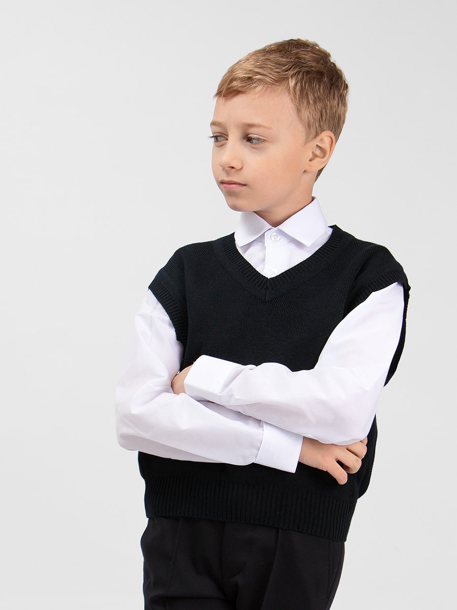 Классический трикотажный жилет, с V-образным вырезом. Фактура ткани вязаная, по низу изделия широкий, эластичный манжет. Идеальный выбор для создания элегантного школьного образа. Размер 128 (рост 122-128 см) длина изделия 50 см, обхват груди 70 см. Размер 140 (рост 134-140 см) длина изделия 54 см, обхват груди 74 см. Размер 152 (рост 146-152 см) длина изделия 60 см, обхват груди 80 см. Размер 164 (рост 158-164 см) длина изделия 68 см, обхват груди 86 см.